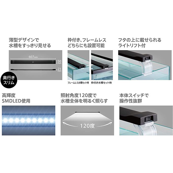 [特長]:■60cm水槽にフィットするスリムなデザインに1000ルーメンの明るいLEDを搭載[仕様]:■対象:幅60cmのフレームレス水槽(ガラス厚6mm以下)幅60cmの枠付き水槽■淡水・海水両用■数量:1個(ライトリフト付属)■定格電圧:AC100V50/60Hz■定格消費電力:17W■使用アダプター:入力:AC100V出力:DC12V1.5A■明るさ:1000lm■色温度:11000K■演色性:Ra80■原材料:ABS、PS、アルミ他■生産国:中国■色:ブラック[サイズ]:■サイズ(約):幅60.7×奥行5.0×高さ2.1cmアダプターコード長:1.8m■体重量:0.45g